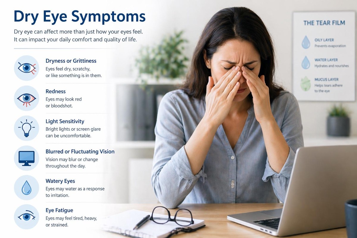 It’s often a combination of these factors working together that makes symptoms feel sudden or intense. Blinking more frequently can offer short-term relief during screen-heavy days, though this works best alongside a broader approach to managing dry eye.